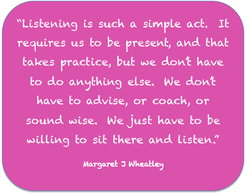 But I wouldn’t be honest with myself, or with you, if I didn’t admit that sometimes, listening is hard. I know I have to focus more when a client is sharing a really sad tale; and I can occasionally drift off into a moment where I wonder how I might have done it differently. Talking to other coaches, I sense this is a challenge we all face, and for the most part we accept it and try to not let it interfere with the work we do with our clients. Being aware of my tendencies, getting back on track and re-focusing on my clients super-quick are skills as a coach that I’ve picked up pretty quickly. It’s consciously competent territory.