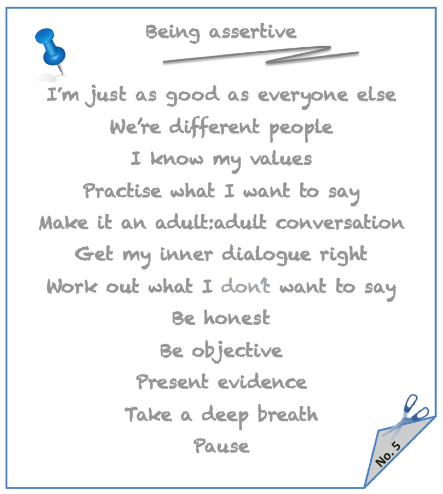 Note to self . . . Being assertive No. 5 in my Note to self series. Print if off, cut it out, keep it close. Share this:Tweet Click to email a link to a friend (Opens in new window) Email Click to print (Opens in new window) Print More Click to share on Reddit (Opens in new window) Reddit Share on TumblrPocketLike Loading...