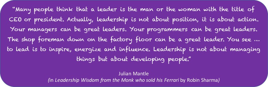 I rather like Robin Sharma’s classic, Leadership Lessons from the Monk who sold his Ferrari, and especially this definition of leadership which comes close to something I’m comfortable with when trying to understand exactly what leadership is. See what you think.