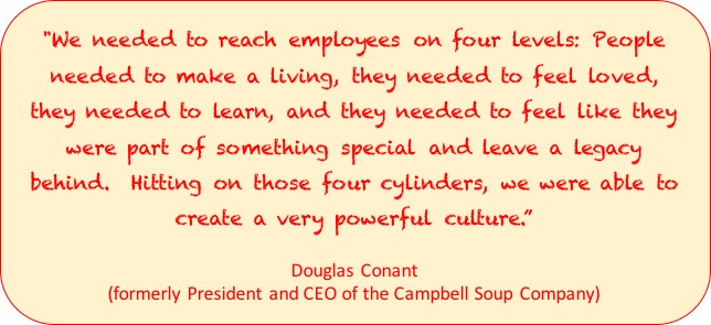 I especially like the idea of making employees feel like they’re part of something special. I also love that as a self-acknowledged introvert, Mr Conant put himself purposely out of his comfort zone in response to a real need to take his leaders to a “higher ground” – and in 2010, his company’s research showed that for every 17 engaged employees, only one was disengaged.