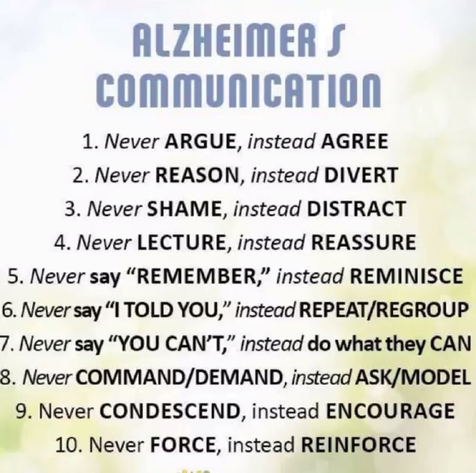 My daughter very kindly sent me this poster about Alzheimer’s communication as a reminder that it was exactly the approach we took with her beloved grandmother when she was struck down by this most awful condition.