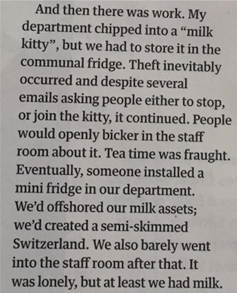 Coco Khan writes a lovely piece about conflict, referencing first the milk ownership battles she experienced while living in a shared house. Later, she takes the argument into the workplace: